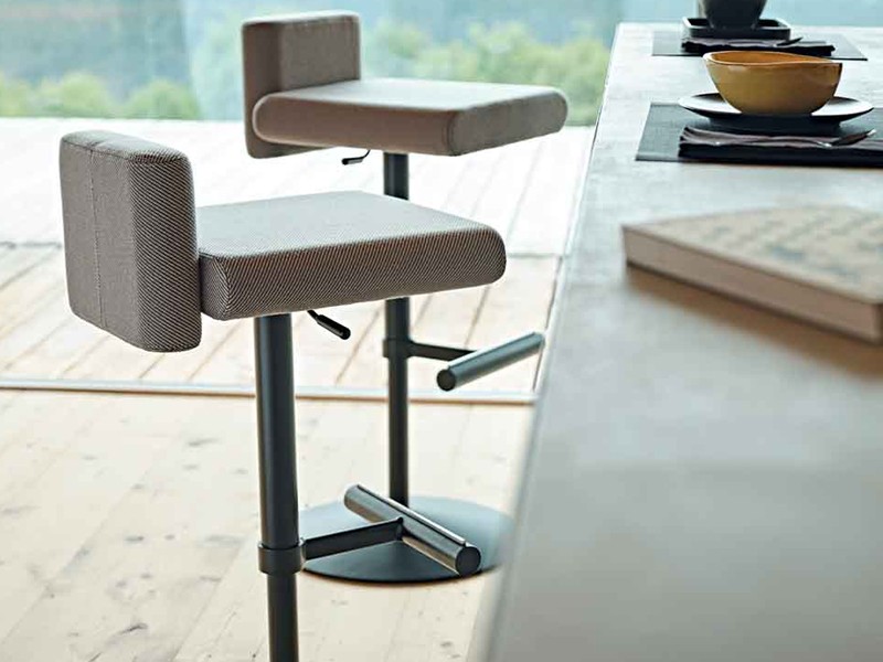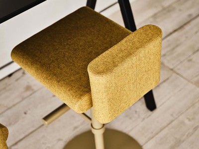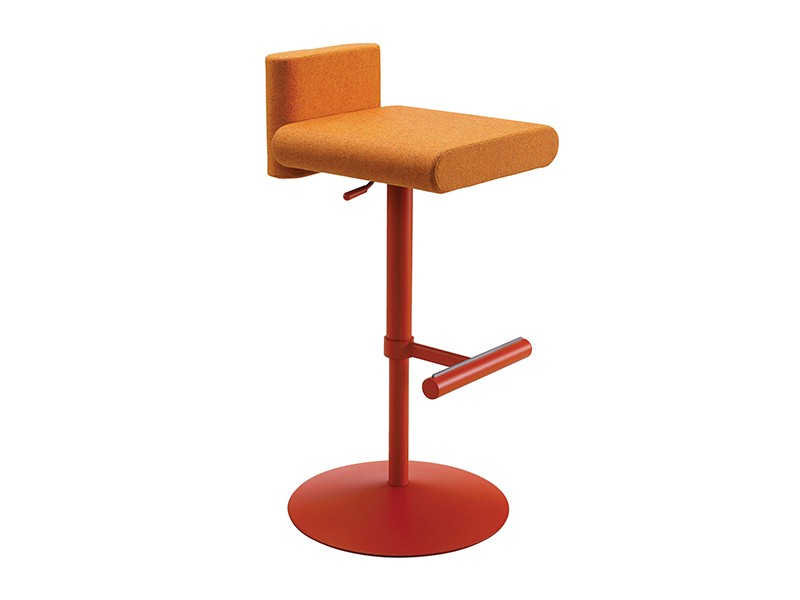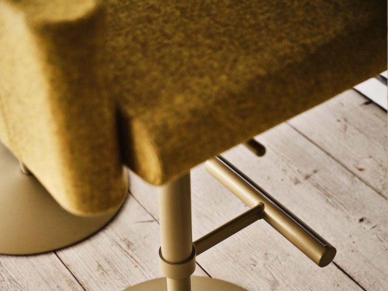 - Een draaibare en in hoogte verstelbare kruk met een metalen frame dat mat gelakt is.