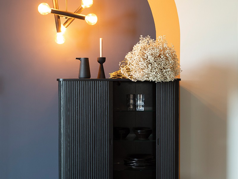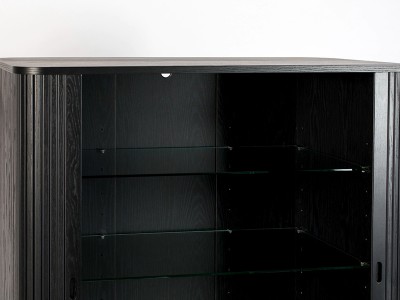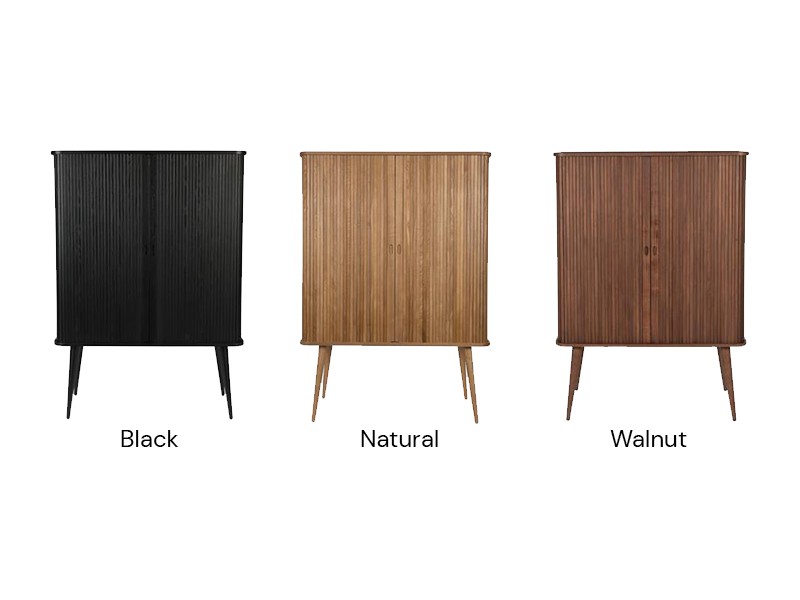 - Boven- en onderkant van MDF met fineer, binnenpanelen van MDF met folie, poten en roldeur van massief hout.