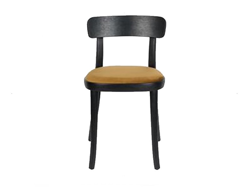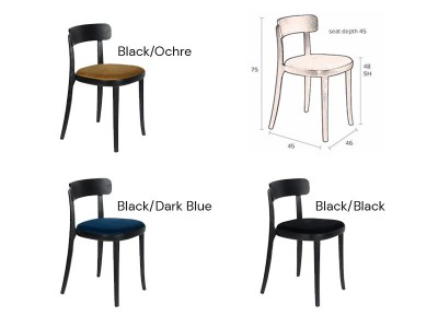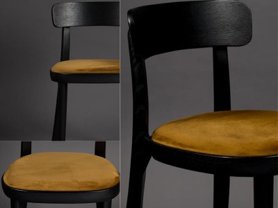 - De zitting is bedekt met 100% polyester fluwelen stof, verkrijgbaar in okergeel, donkerblauw of zwart.