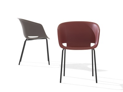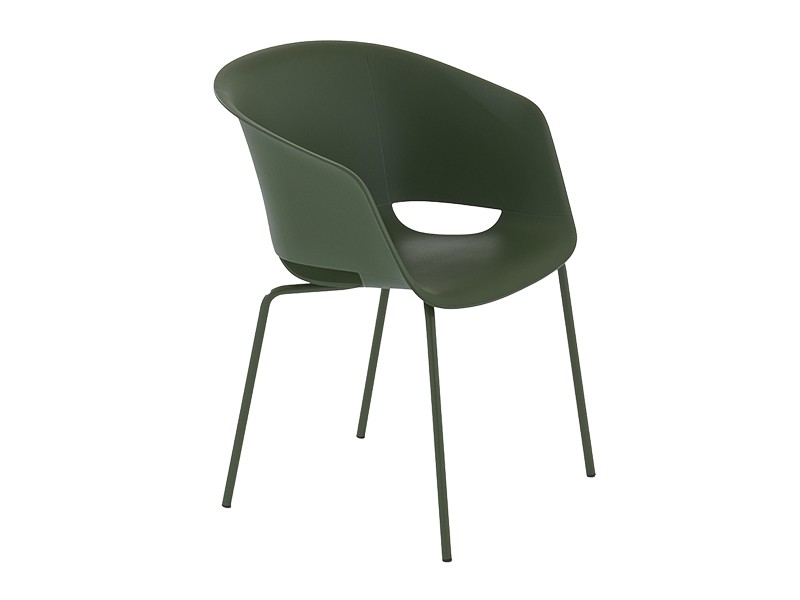 - Deze stoel heeft armleuningen en een open kuipontwerp dat wordt ondersteund door een stalen frame met vier poten.