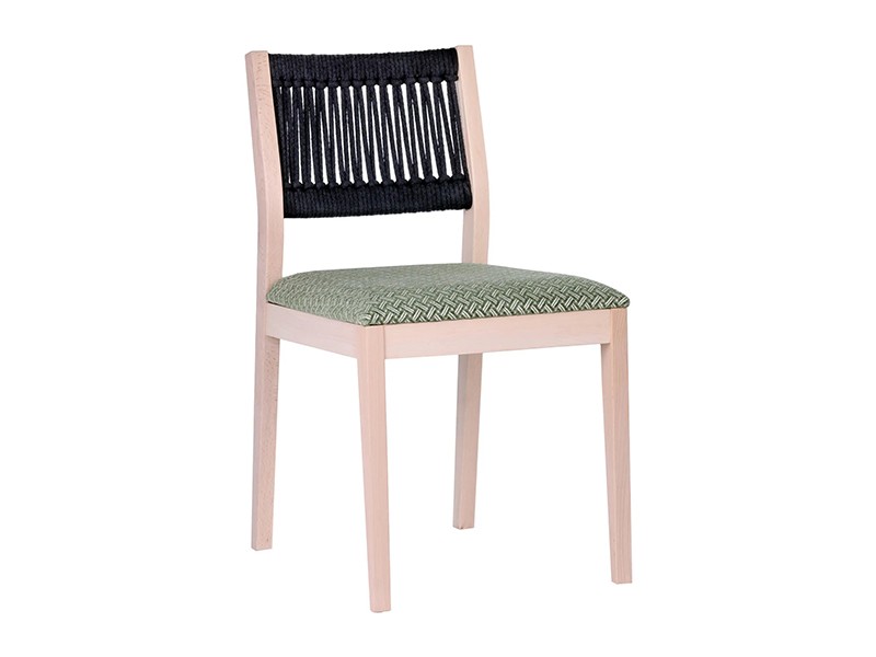 - Gestoffeerde beukenhouten stoel met gevlochten rugleuning.