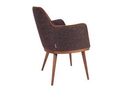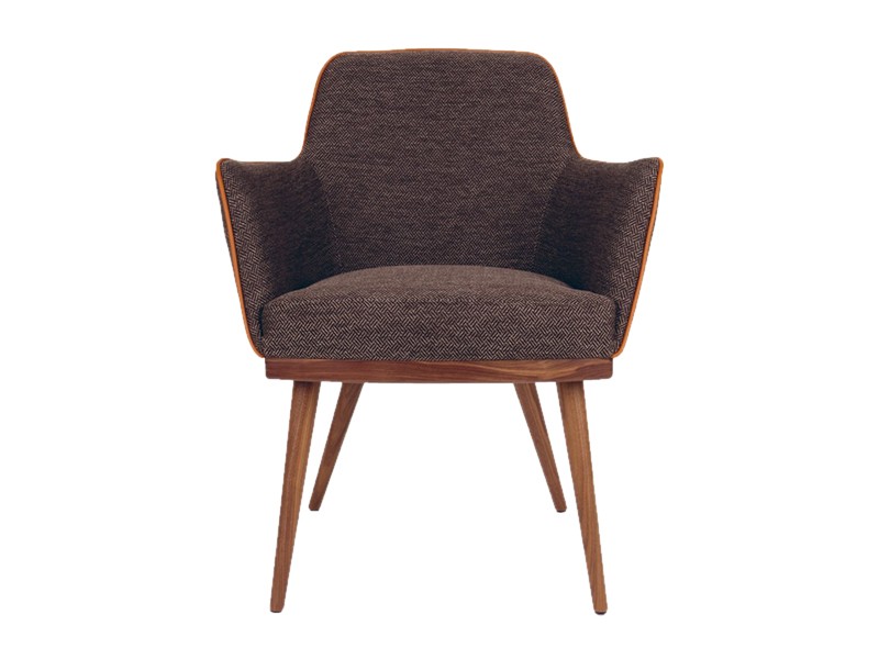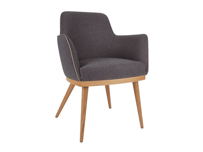 - Gestoffeerde houten stoel met armleuningen, met een frame dat verkrijgbaar is in natuurlijk hout of verschillende afwerkingen.