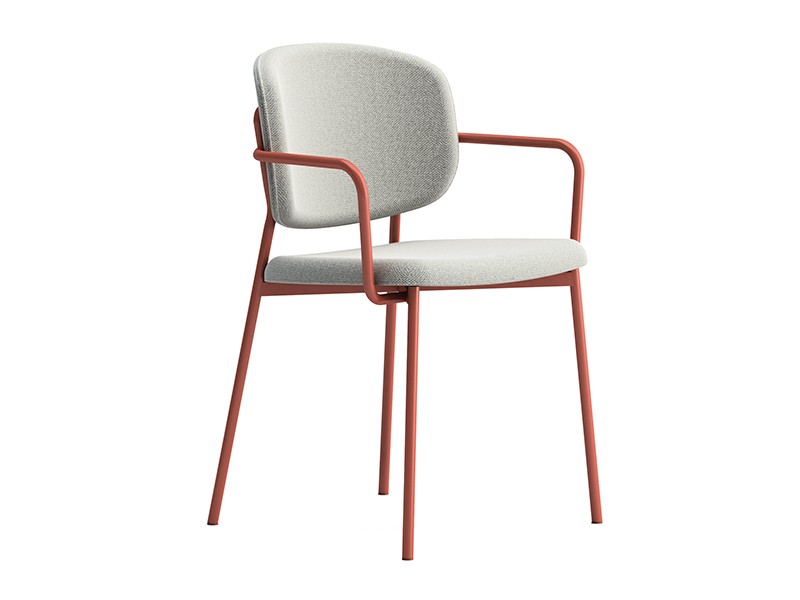 - Stoel met metalen frame en gestoffeerde zitting en rugleuning die compacte en gezellige proporties hebben.