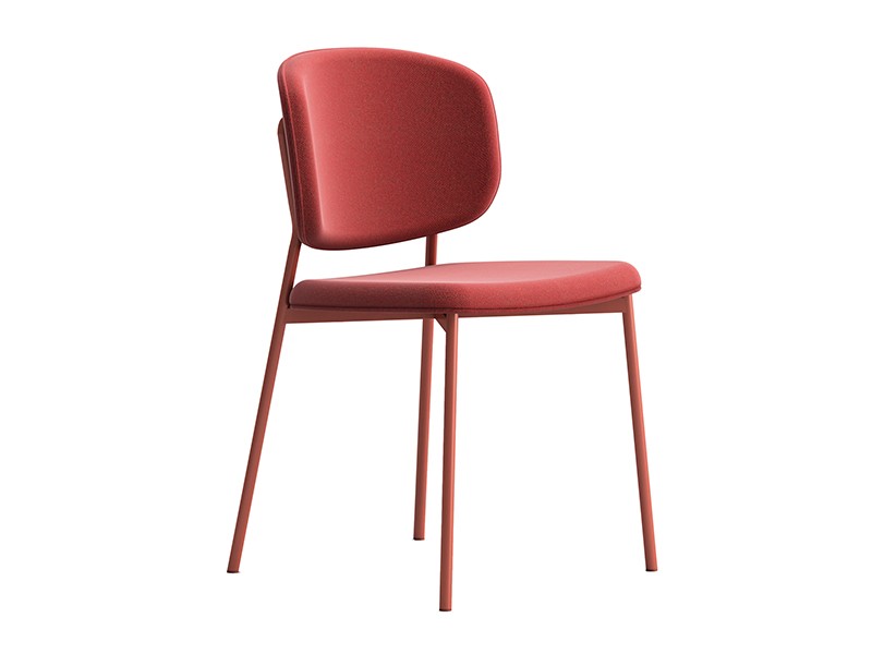 - Stoel met metalen frame en gestoffeerde zitting en rugleuning die compacte en gezellige proporties hebben.