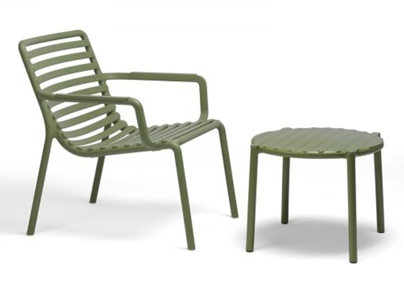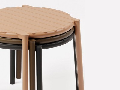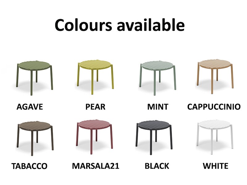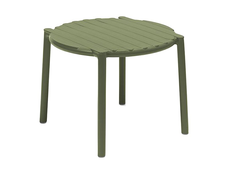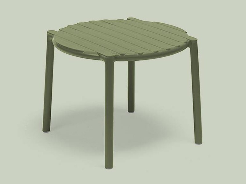 - Monobloc bijzettafel in glasvezelhars met een rond blad en een nieuw, lichtgewicht ontwerp.