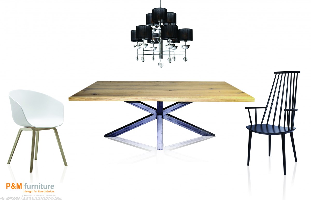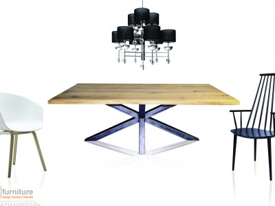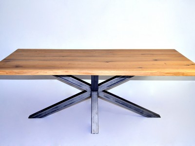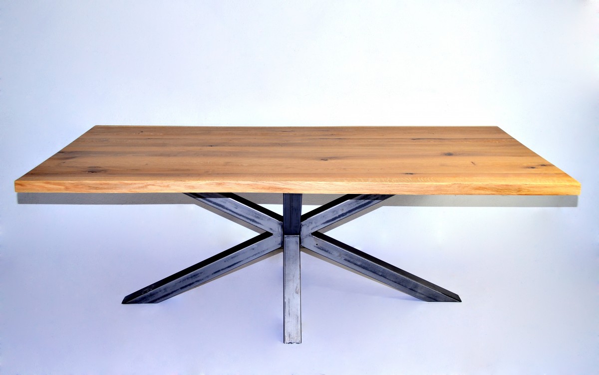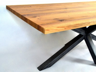 - Het tafelblad is gemaakt van geschaafde rustiek eiken planken. Het onderstel is van onbehandeld staal. Het is een zeer stevig en stabiel onderstel in de vorm van een dubbele X extra lang.