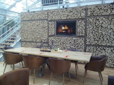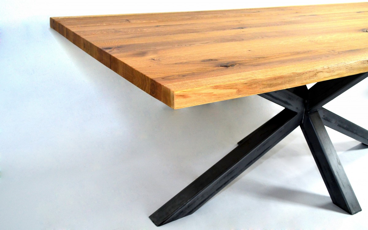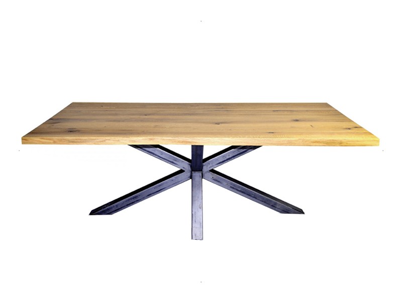 - Tafel met een 4 cm eikenblad en een stalen dubbele X onderstel (Extra lang 8x8cm)