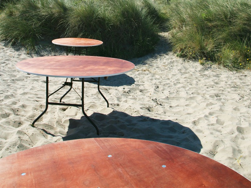- Ocean Round is een ronde klaptafel met multiplex tafelblad, afgewerkt met PVC rand en epoxy zwart stalen frame.