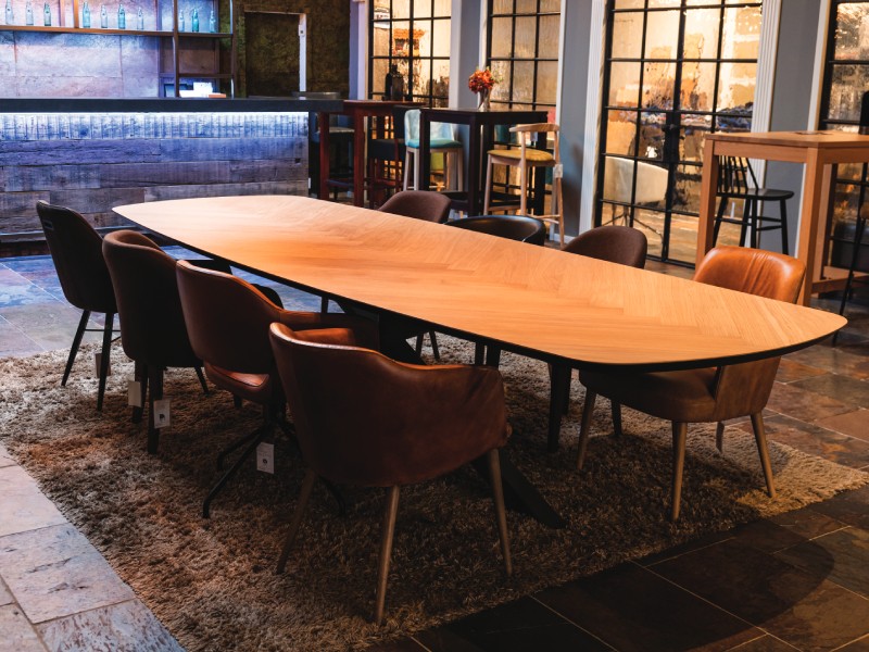 - De Grand Table combineert een stalen gelakt onderstel met een fascinerend tafelblad met een kenmerkende visgraatstructuur.