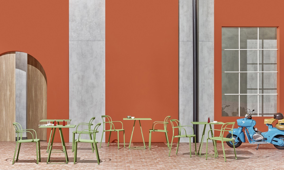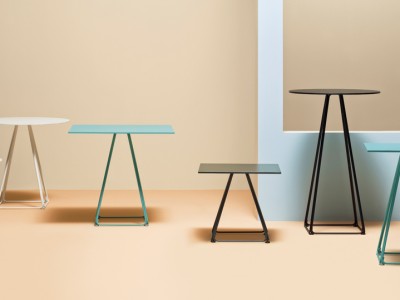 - De basis bestaat uit vier trapeziumvormige stalen staven en kan worden gecombineerd met tops van verschillende afmetingen en afwerkingen.