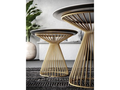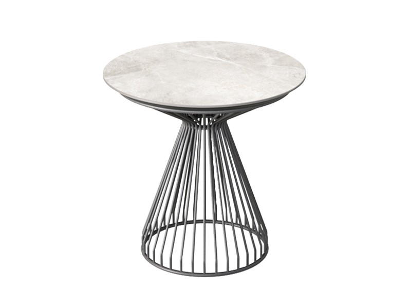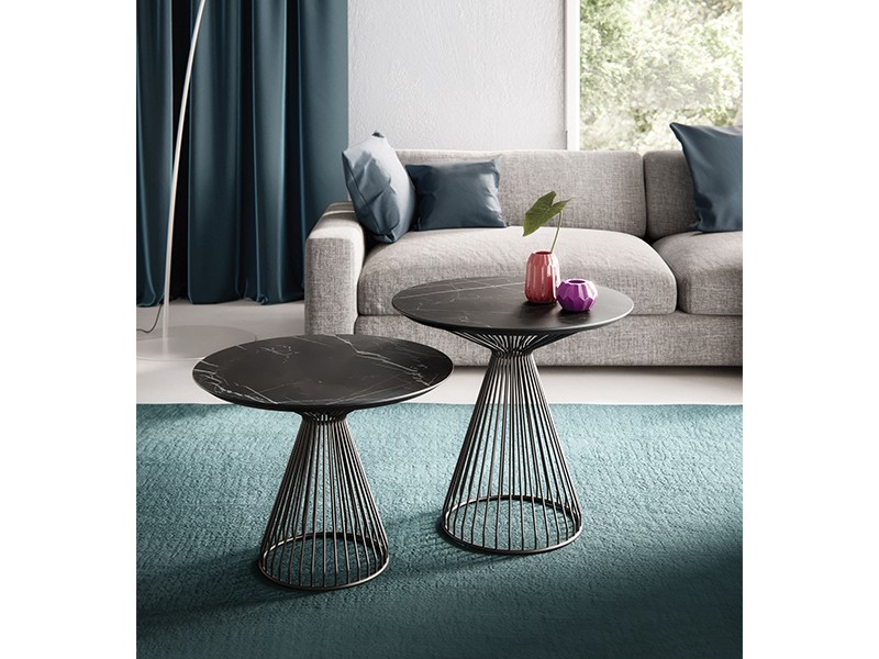 - Een bijzettafel met een stalen onderstel en een rond blad van keramiek of HPL, in verschillende kleuren en twee verschillende hoogtes.