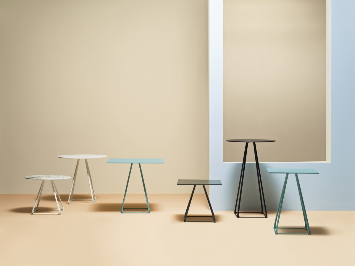 - De basis bestaat uit vier trapeziumvormige stalen staven en kan worden gecombineerd met tops van verschillende afmetingen en afwerkingen.