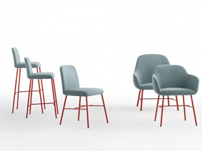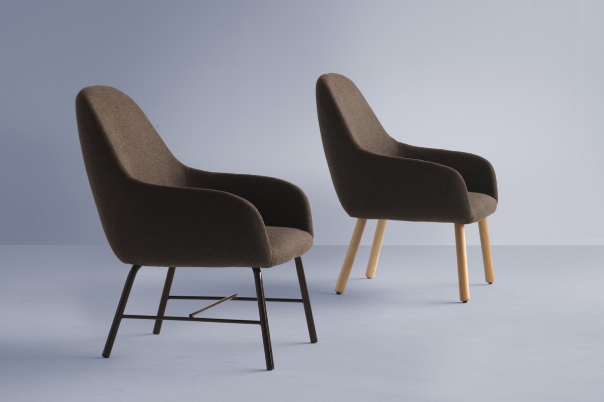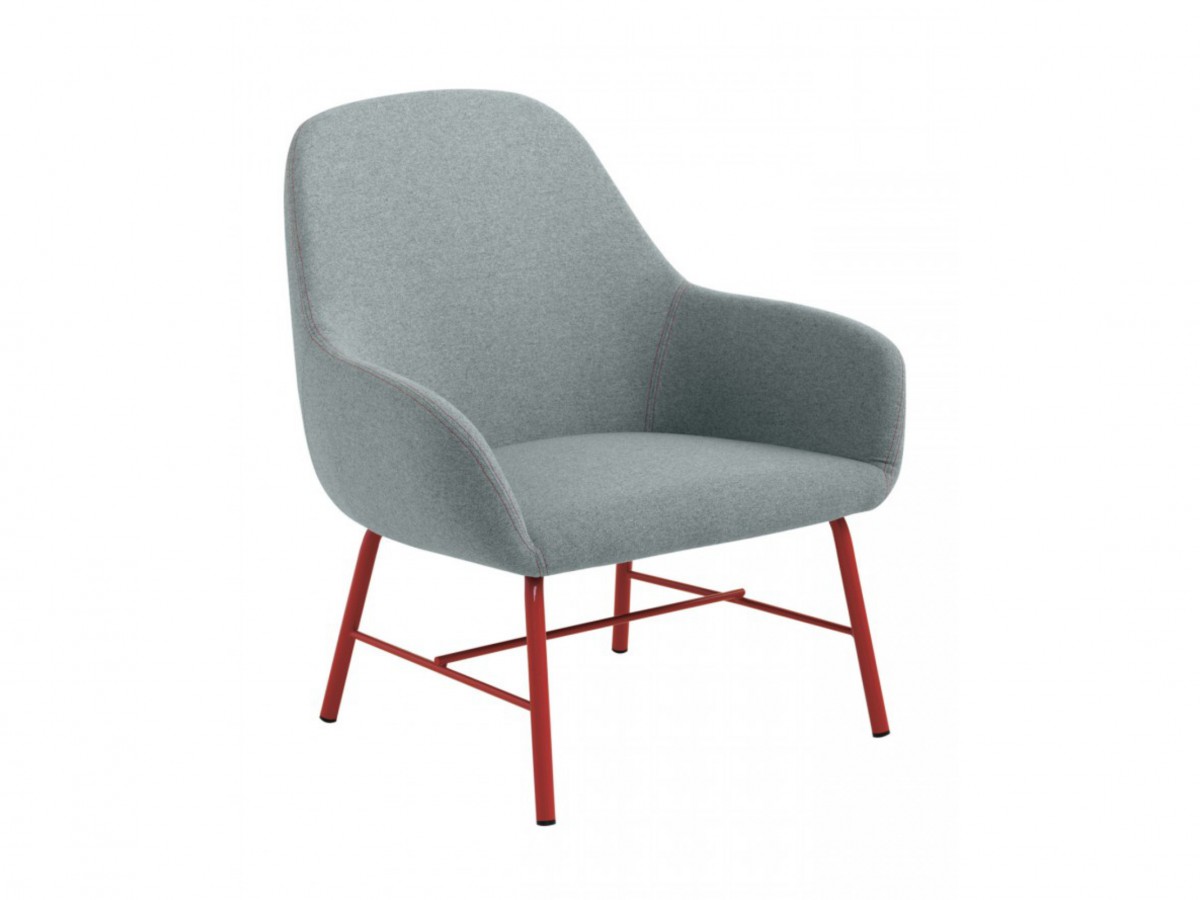 - Lounge chair with steel frame and shell upholstered in fabric.