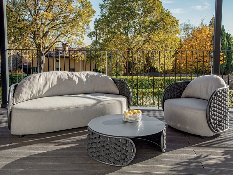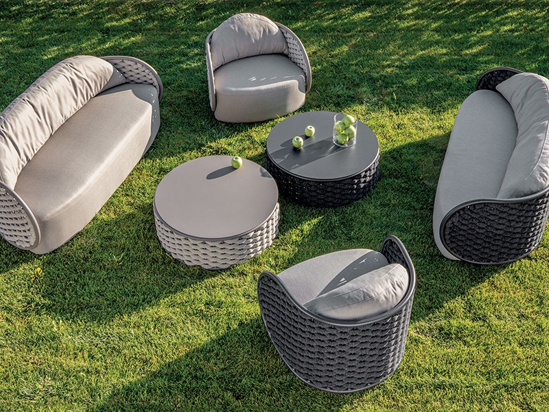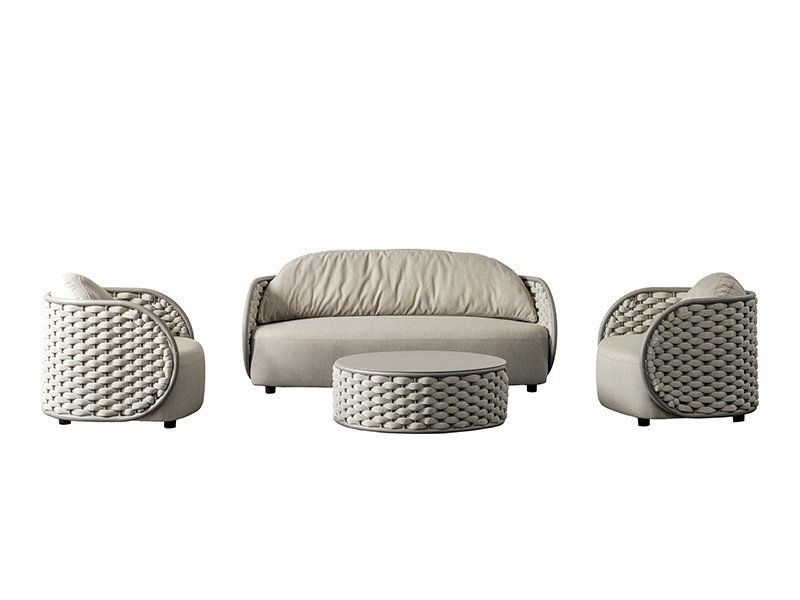 - De fauteuils en bank zijn elegant bekleed met een combinatie van textylene en rubber touw, wat zowel duurzaamheid als modern design uitstraalt.