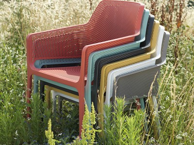 - Stapelbare fateuil gemaakt van uniform gekleurde glasvezel polypropyleen harsen met uv additieven.