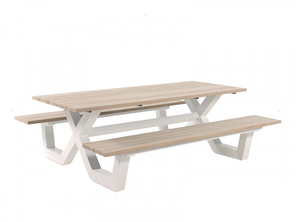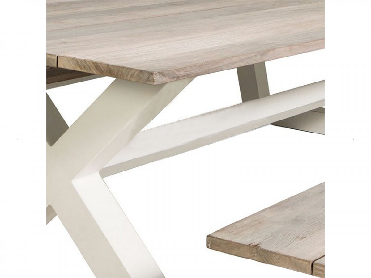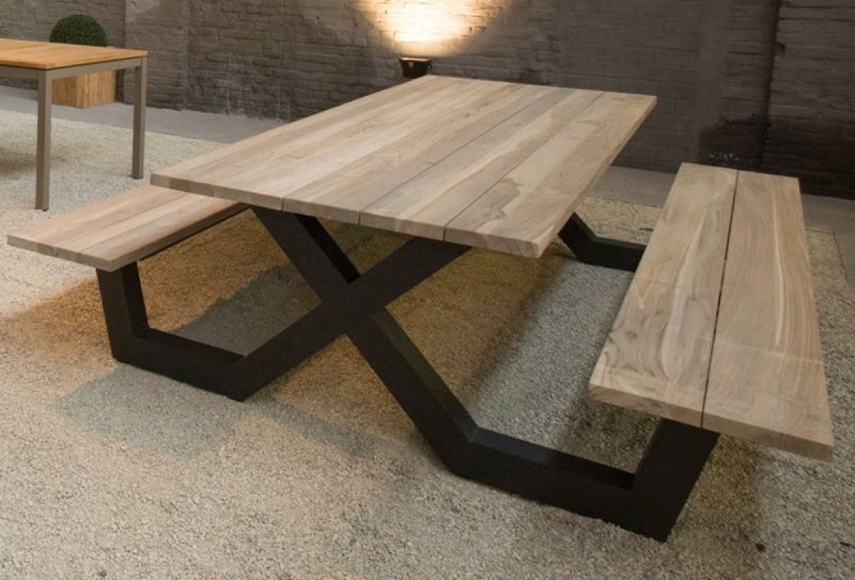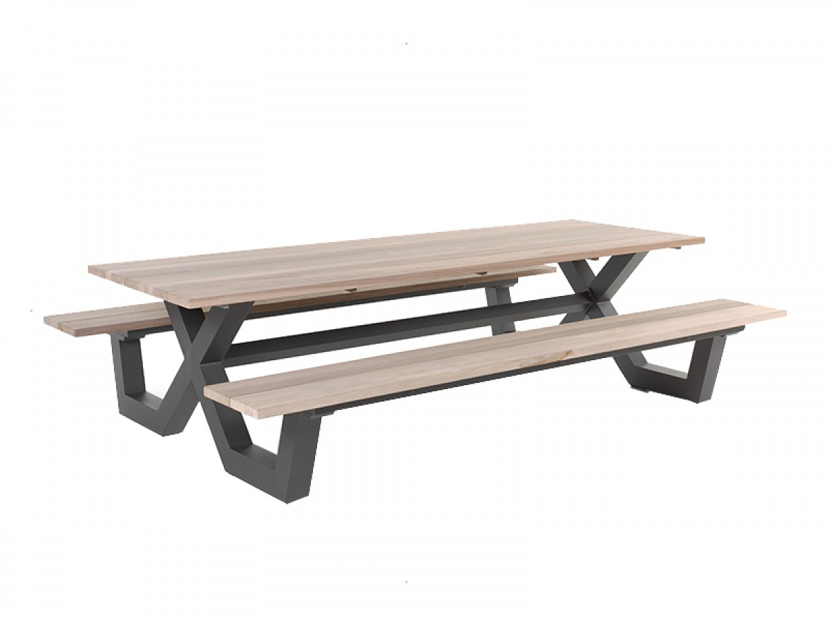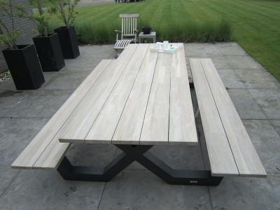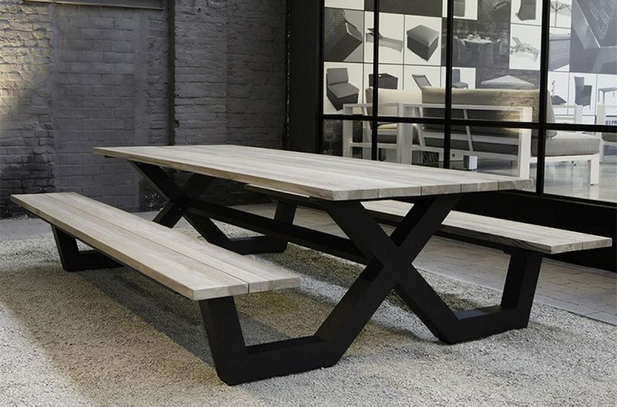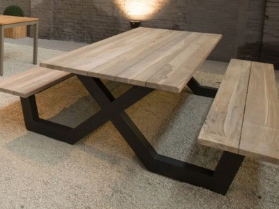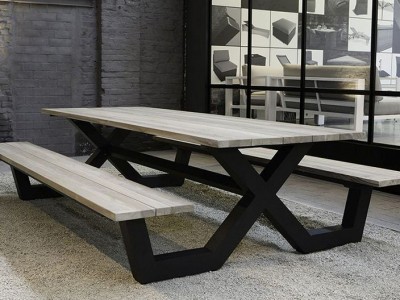 - Tafel- en bankenset voor buiten, met een sterke structuur en een onderscheidend kriskras design.