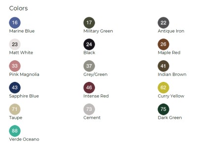 - Kleuren: antiek ijzer, mat wit, zwart, grijs/groen, indian bruin, donkerblauw, mint groen, scharlaken rood, groen, blauw, oranje, taupe, cement, corten, koper